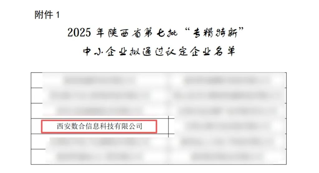 近日,陕西省工业和信息化厅正式公示了2025年陕西省“专精特新”中小企业拟通过认定企业名单,数合科技凭借在数据分析与智能决策领域的深厚技术积累、持续的创新能力以及卓越的市场表现,荣获“专精特新”中小企业称号。